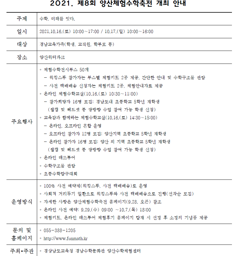 2021년 제8회 양산체험수학축전에 대해 아래와 같이 안내드립니다.